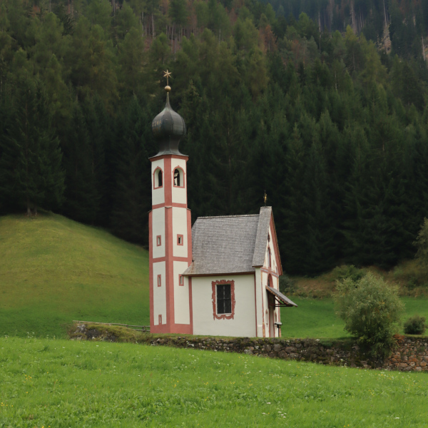 St Giovanni (Chiesa di San Giovanni) is a beautiful, small church with hand-painted frescoes of the patron saint, St John, and an onion dome the colour of charcoal. It is framed by endless green meadows, forests and the massive, pointed peaks of the Odle mountain group.